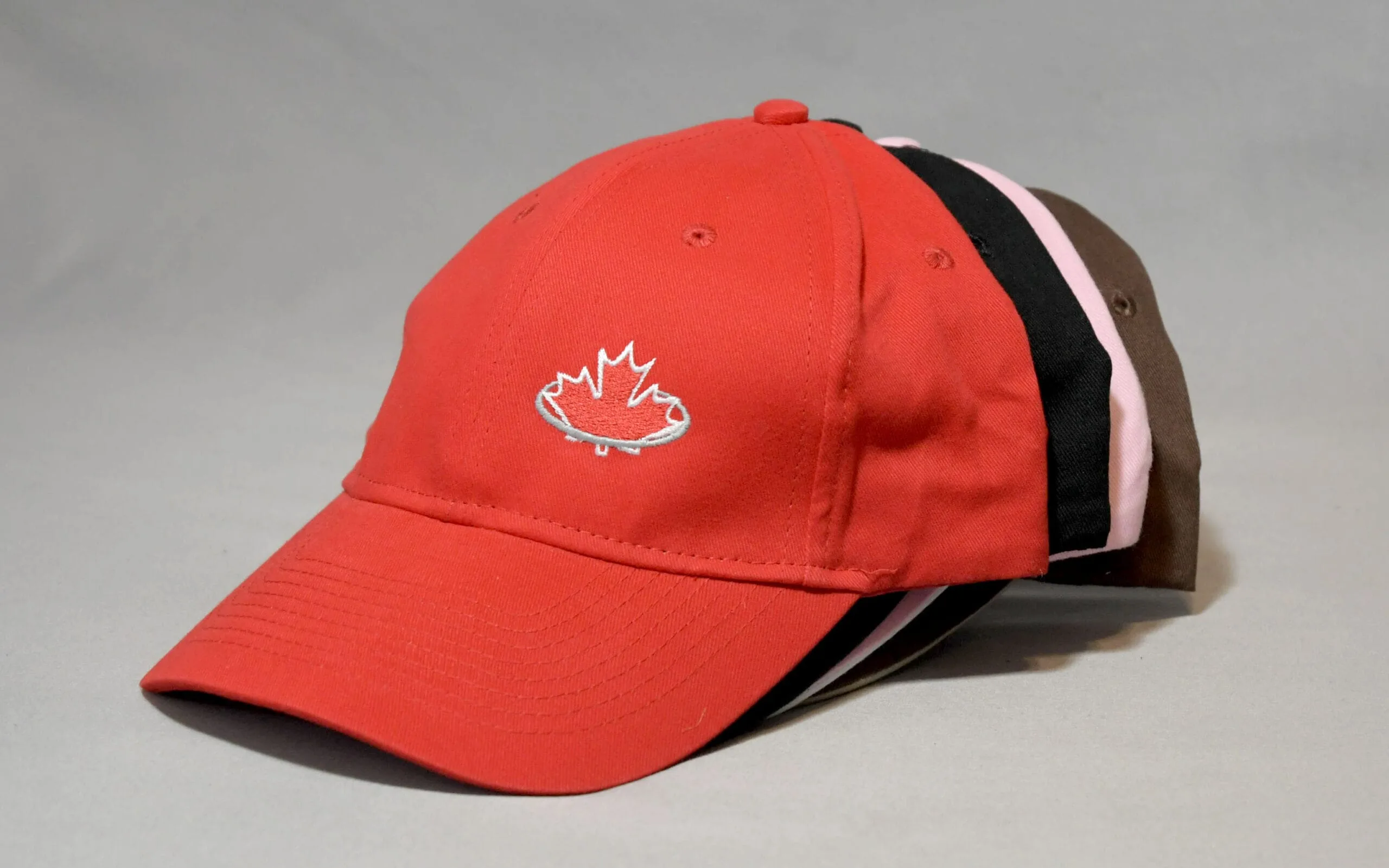 Black, white, red and brown trucker hats